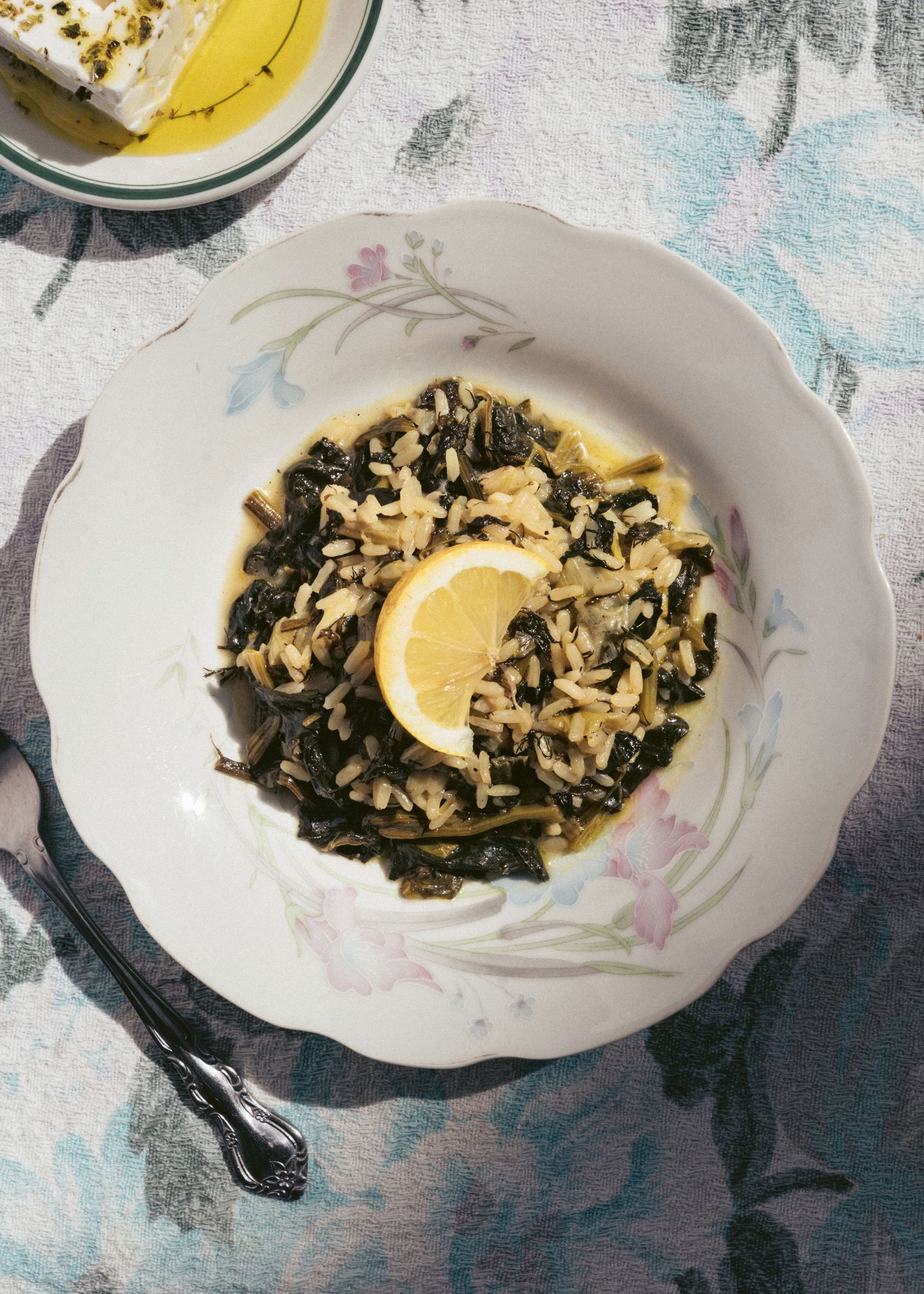 4. Once the rice is tender, season again to taste and add a squeeze of lemon for a final zingy flourish. Served with a slab of feta, an extra drizzle of olive oil and plenty of crusty bread.