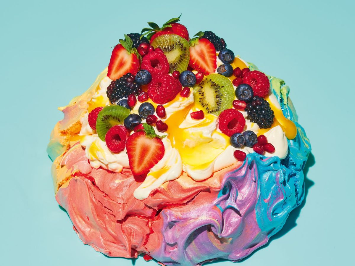 “My rainbow pavlova consists of chic, pastel-coloured, peppermint-flavoured meringue, topped with whipped cream, tart mango curd and fresh fruit,” says Domagala.
